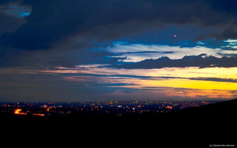 A Sunset shot taken from hills near Ogden reservoir: Rochdale and its surrounding areas are off to the right side of the picture and Milnrow is to the centre-left, which includes the blurred, snaking lights of the M62 on the far-left disappearing off in the distance towards Royton.