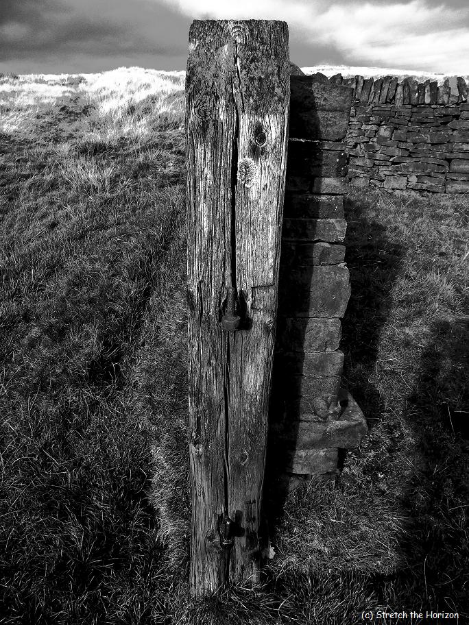 An old gate post – rendered in black and white – shows the long-term effect harsh weather has had upon its wood. Now course and brittle due to exposure, the post shows large fractures running its length, where the gate’s hinge pegs were hammered in many years before and only the knots have stayed a constant on the wood’s surface. As for the gate, it’s just a distant memory to the Sheep that pass through the gap.
