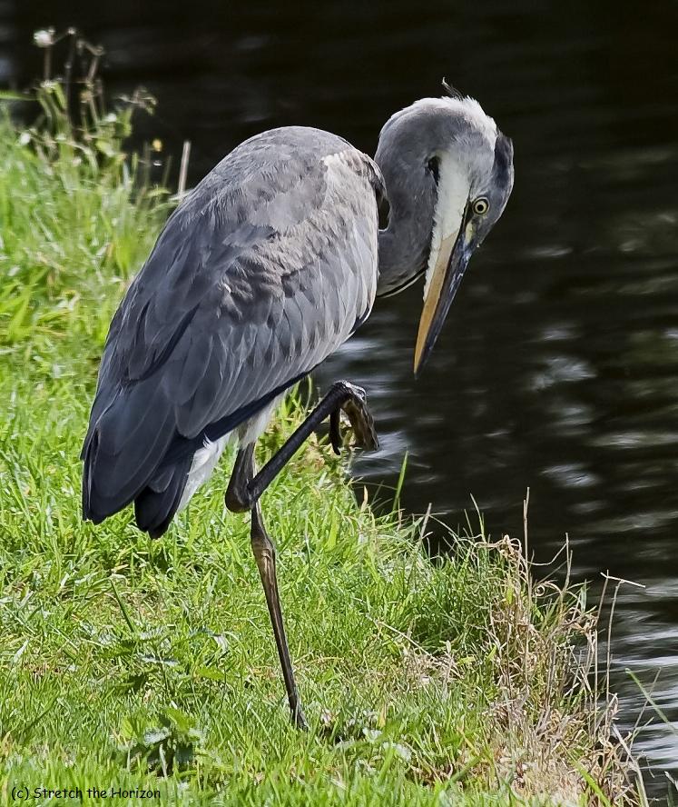 A grey Heron takes time out from fishing to check over its long webbed toes on the Rochdale canal in Middleton. The fact that this picture was taken at noon, with the sun high above and baking down, plus that the Heron was actually on the tow path side of the canal with people probably goes some way to explaining why this wader was failing to catch any fish…
