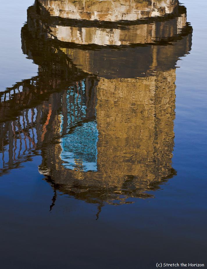 The reflection of Ogden reservoir’s water valve tower, complete with rusting gantry and door painted in blue anti-climb coating (just above the door can be seen two prongs, which have barbed wire running between them: this is just in case there’s a climbing zealot out there whose intent on carrying onwards)!