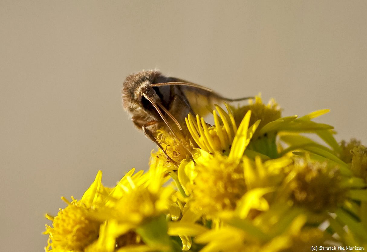 A close-up shot of a Large Yellow Underwing Moth, expertly probing for some nectar with its long proboscis in and around the yellow flowers of this Common Ragwort.