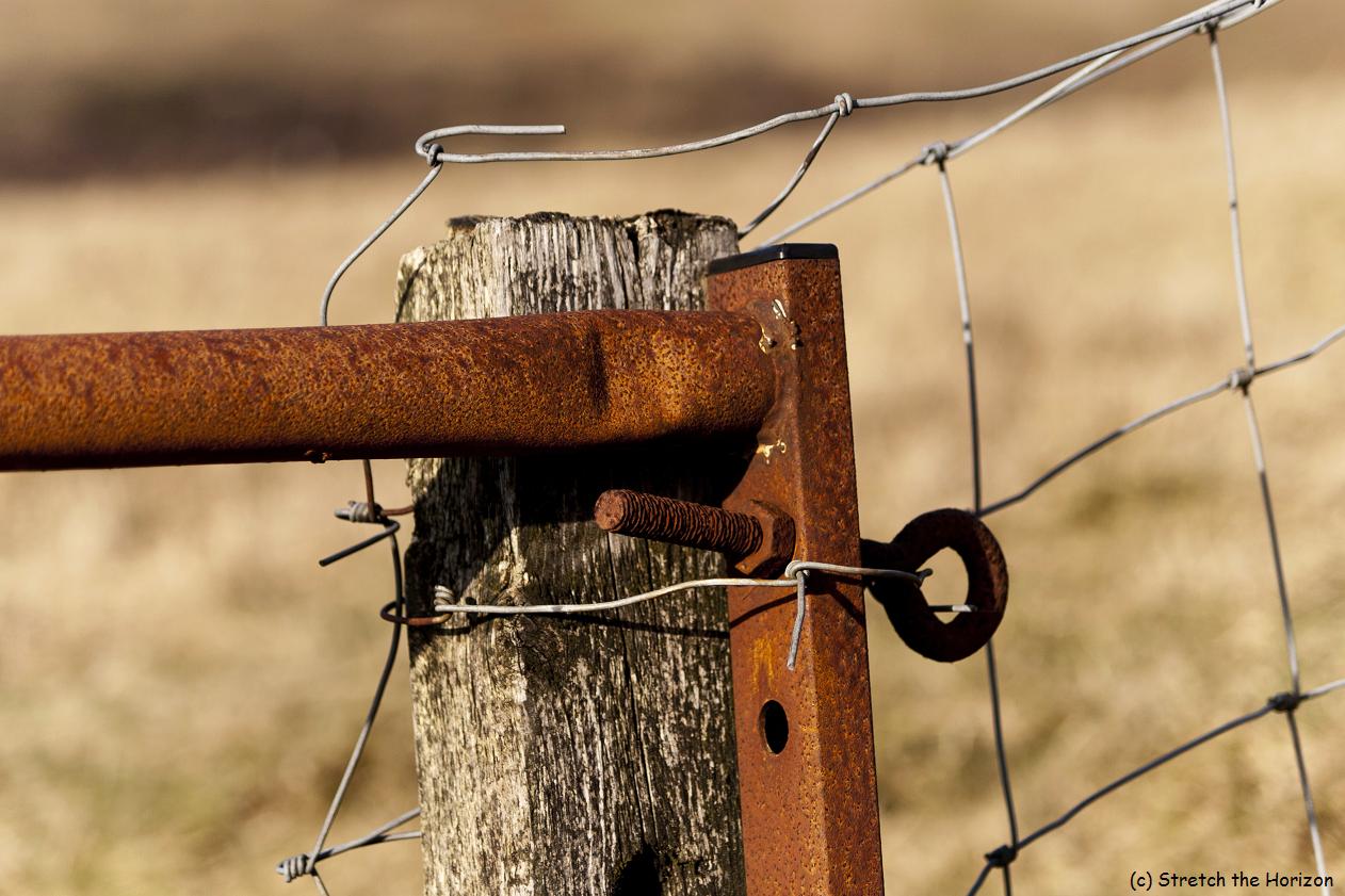 An old fence post, now rotten and dried out from the moorland weather, has become the only support for a rusted and worn metal gate. However, because the wood’s too far gone and no purchase can be found in order to secure the gate’s hinges, the Farmer’s just decided that a twist of some of the fencing wire will be enough to hold it all in place, for this year at least!