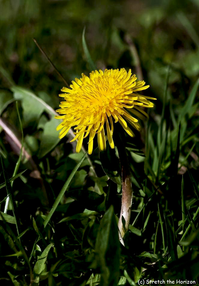 A close-up shot of the yellow flowering head of the Dandelion, the stalk beginning to kink as the weight of raising the many hundreds of florets towards the sunshine and passing insects takes it toll.