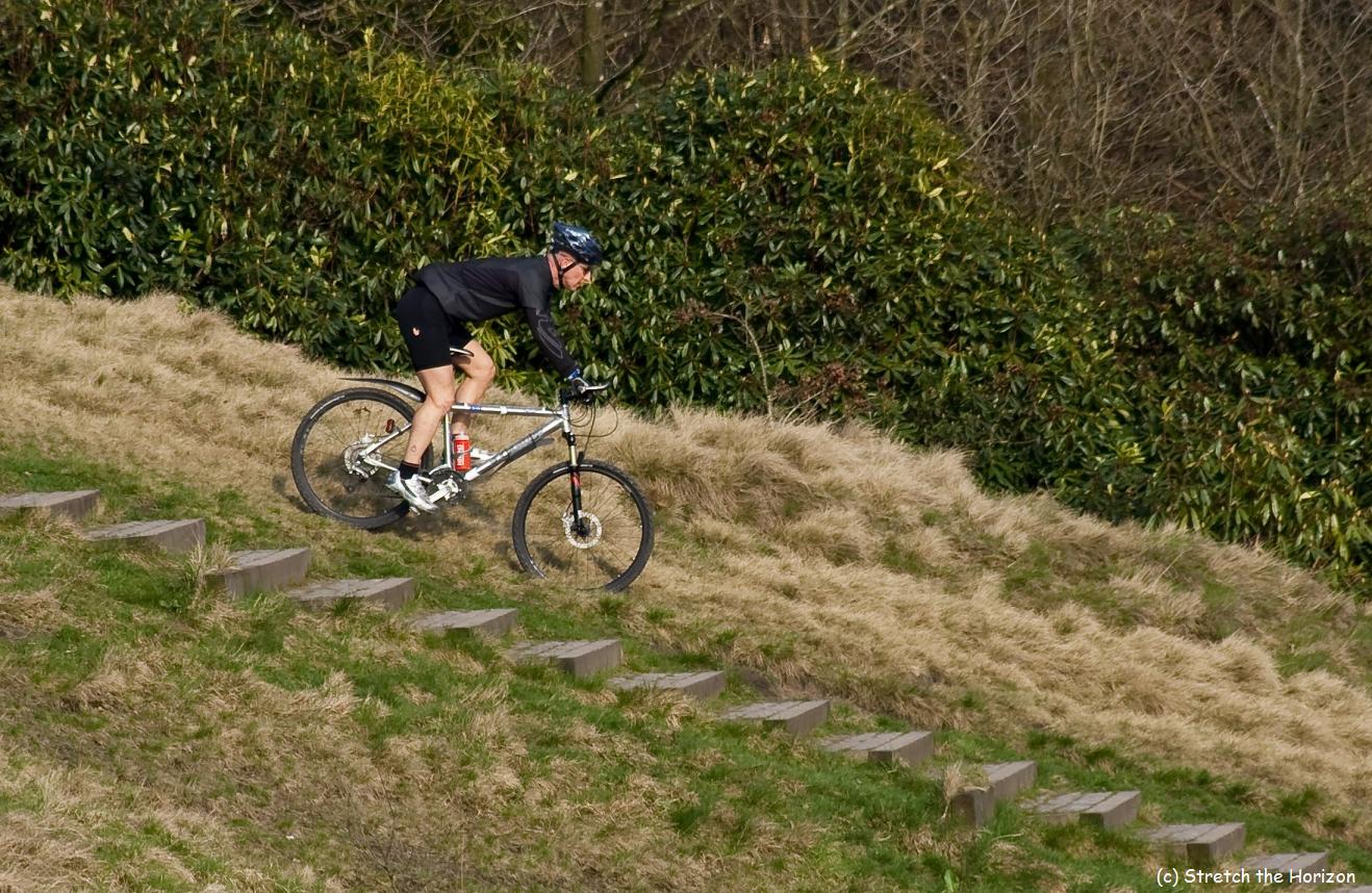 A mountain biker takes his life in his own hands as he descends the steep rear hill down from the Tandle Hills’ Monument: one little error and those steps are ready and waiting to take your tumble from bad to even worse!