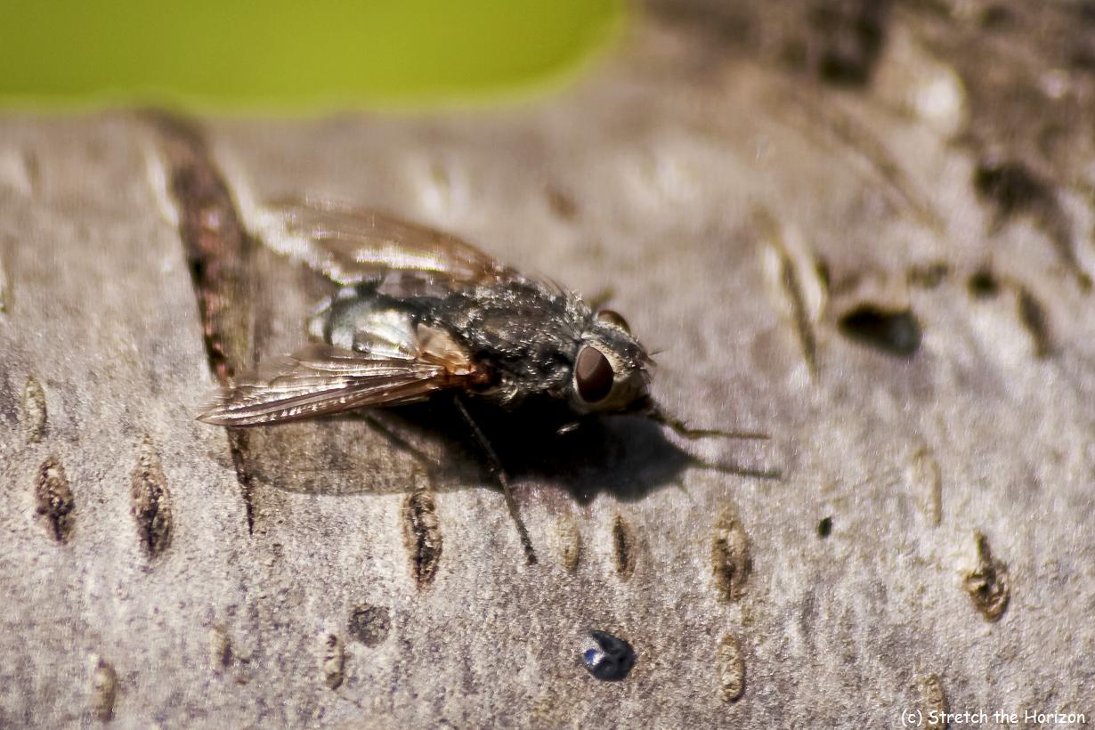 A Cluster Fly sits and warms itself on a Birch tree’s bough in the early morning sun, waiting until it’s time to buzz on to pastures more rotten…