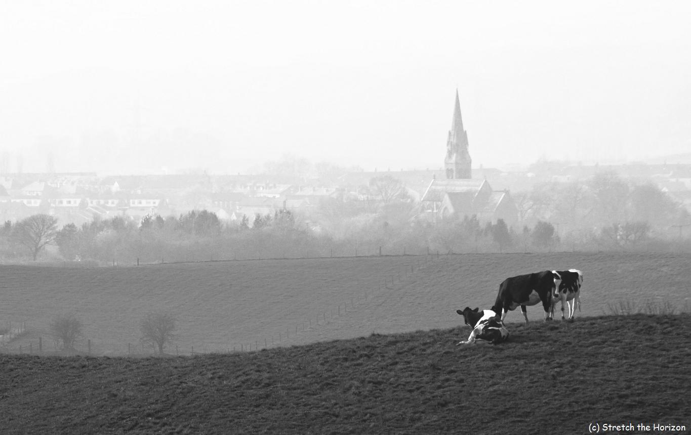 A black and white shot from Tandle Hills from the fields below the Monument and across towards the Church of St. Mary at Balderstone in Rochdale. In the forefront are three Cows: one Cow has its head down busy munching away at the grass, oblivious; the second Cow is flopped down with its back to me, lounging around without a care in the world; but the third Cow has spotted me taking the picture and peers sneakily over from just behind its friend’s bottom!