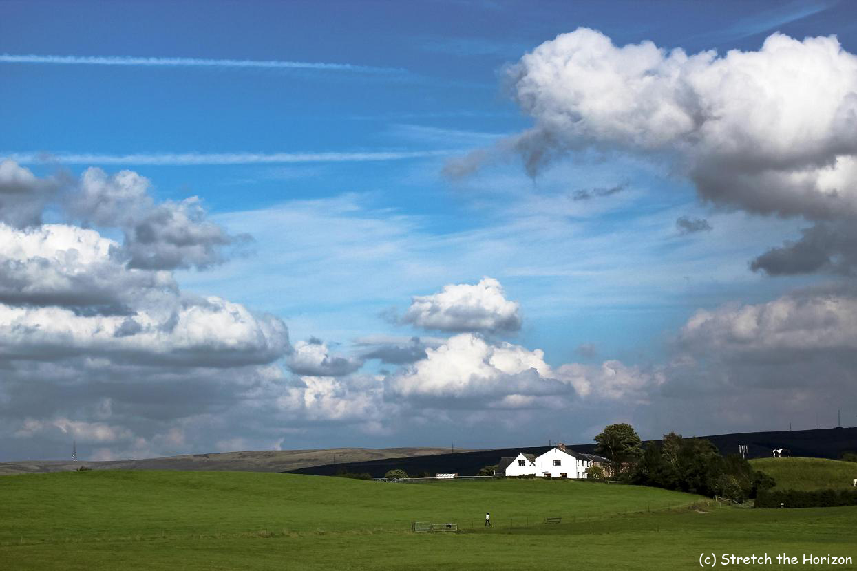 A woman walking her dog can be seen as a tiny white speck as she approaches a white farmhouse, where a white-dappled Horse stands on a nearby hillock, all played out beneath a glorious canopy of little white fluffy clouds turning into grey…