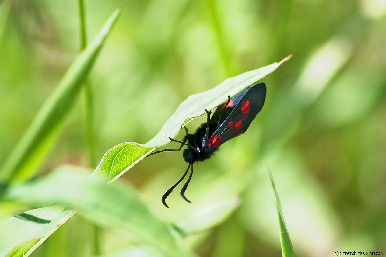 A Six-spot Burnet Moth, seeking a cool spot out of the incessant blaze of the midday Sun, hangs upside down beneath a water reed, its shadow offering just enough solace before the insect has to continue on and fulfil its short lifespan.