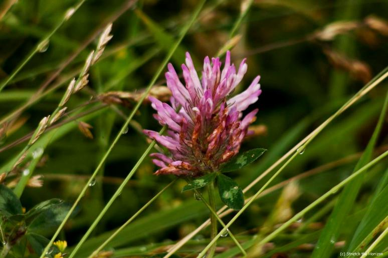 A Red Clover, its vivid pink inflorescence looking spent and tattered, stands tall through the flattened meadow grasses glistening with early morning dew in the hope its remaining finger-like flowers will catch the attention of any passing insects.