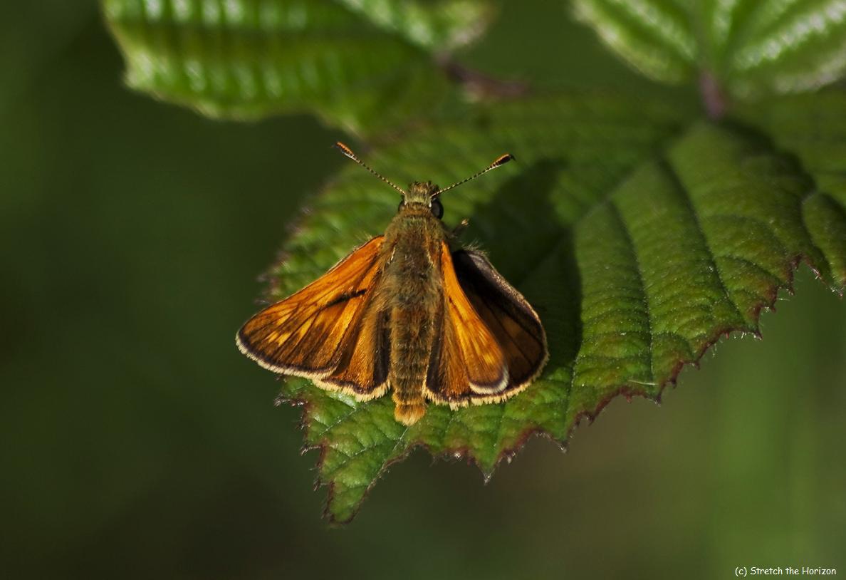 A male Small Skipper Butterfly steals a moment’s rest on a Bramble leaf, its wings’ rustic hues contrasting against the jagged-edged, dark green plant.