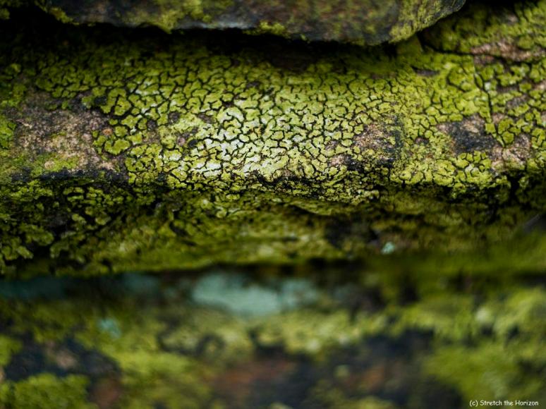 A spread of age-old green lichen on a drystone wall appears dried out and lifeless; however, come the rain and there should be life – but not as we know it – back in the resulting chlorophyll slime…