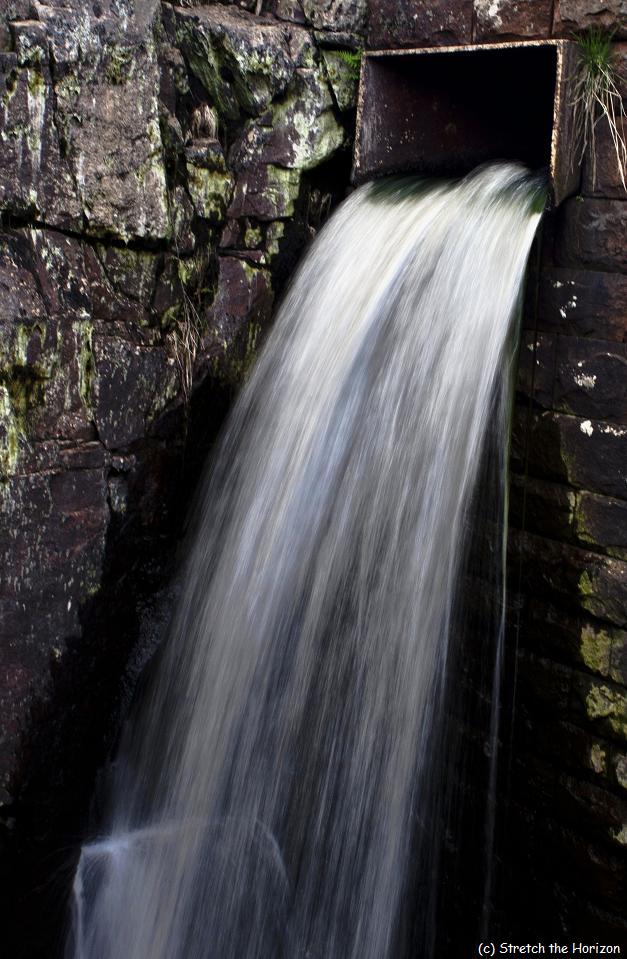 The same overflow pipe at the rear end of Norman Hill reservoir, again shot handheld on a Canon 30d, with an EF 35-70mm f/3.5-4.5 lens without an image stabiliser. This second picture of the water’s flow has been snapped at some of the camera’s slower settings in the hope of ‘blurring’ the tumbling liquid. This time the camera was set at ISO 100, EV-0.3 and an exposure time of 1/8 of a second, the lens was set at one of its slowest aperture stops – f/18 – and once more left wide open at 35mm.