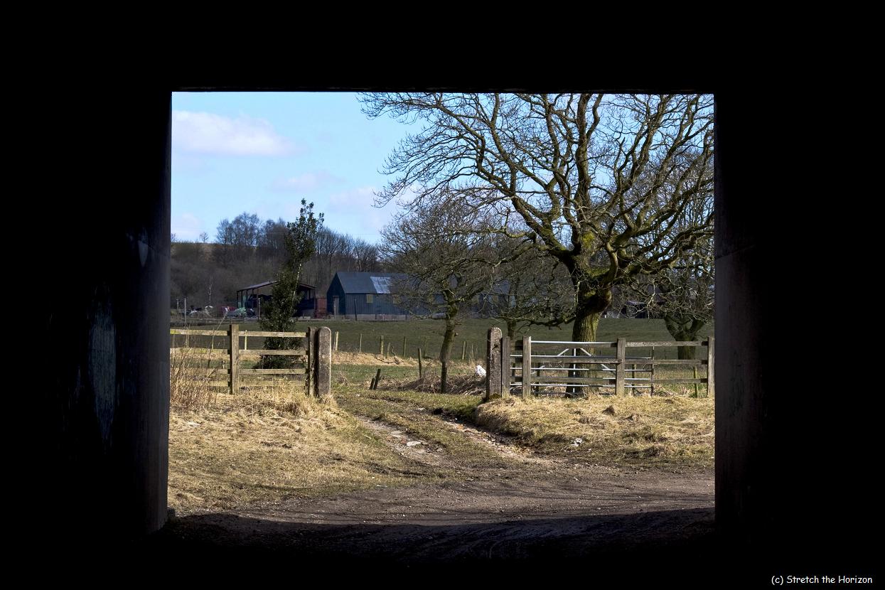 A shot taken from beneath the motorway slip road tunnel at Stakehill in Middleton, looking towards the rear of Tandle Hills and Hough Lane farm. The concrete lintel and walls create a perfect picture frame for the view, albeit in a squarish 4:3 aspect ratio!