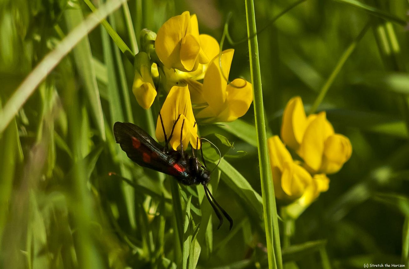 A Six-spot Burnet moth effortlessly hangs upside down and slurps away at this Meadow Vetchling’s yellow flowers, harvesting any available nectar with its flexible proboscis before another insect is attracted by their fragrance.