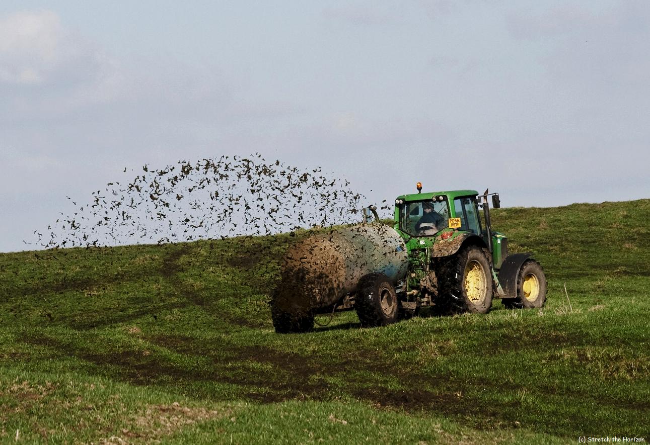 A Farmer empties his tractor-drawn slurry tank across one of his fields, restocking the nutrients back into the soil so next year’s fodder will be productive once more; however to a city dweller walking past, it just looks, smells and tastes like someone spraying a load of sh*t across a field!