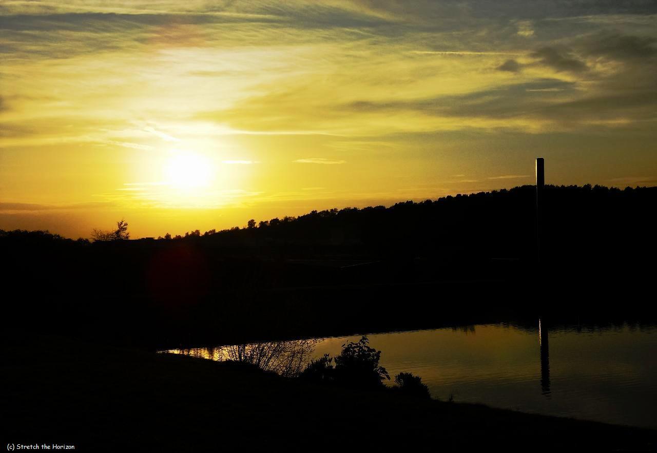 As the Sun begins to go down behind the horizon, this factory’s chromium-finish chimney reflects a mirror image across the water’s surface of a nearby fishing lodge: the burning brilliance of the parting day merges into the pitch shadows of the waking night…