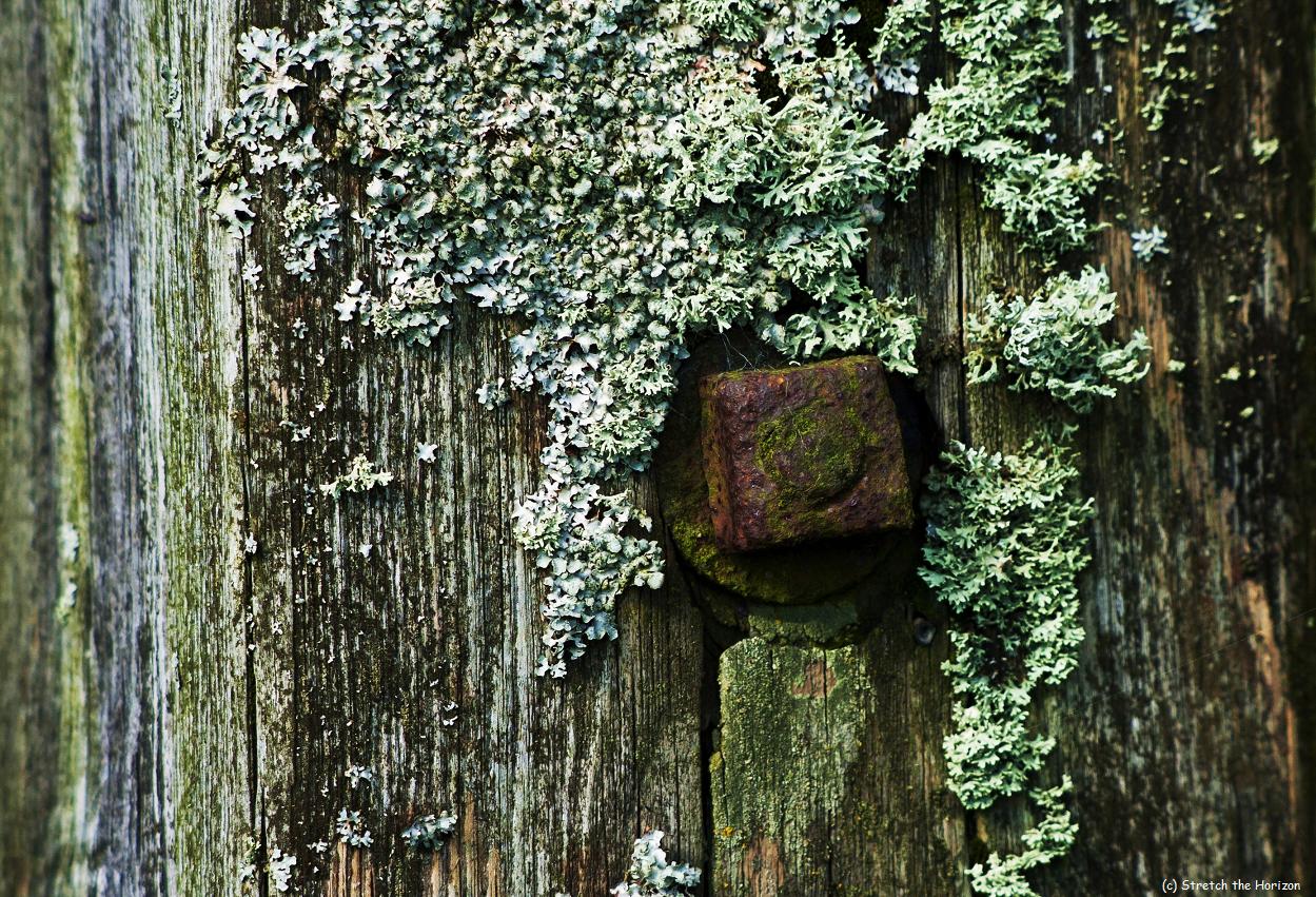 A weathered post shows its age, with a cluster of Lichen surrounding a rusted square nut of the bolt holding its flaking wood together.