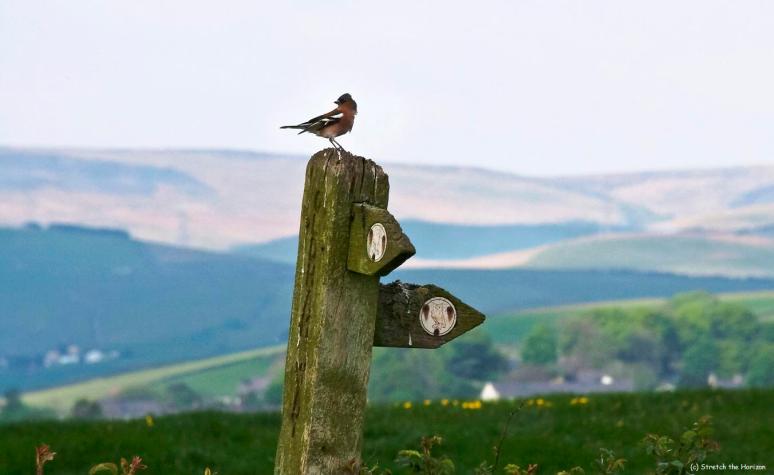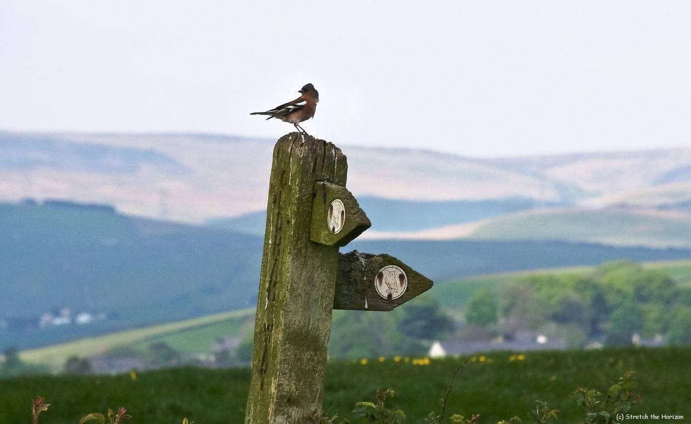 A Chaffinch perches upon a signpost near Tandle Hills – the moorland of Blackstone Edge rolling across the horizon in the background – seemingly confused in which direction to continue!
