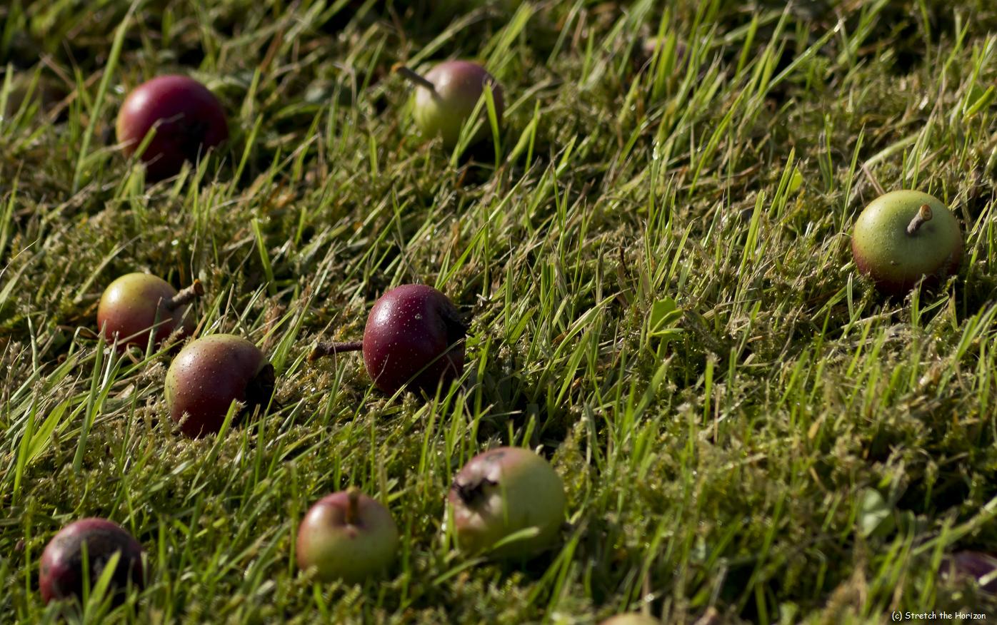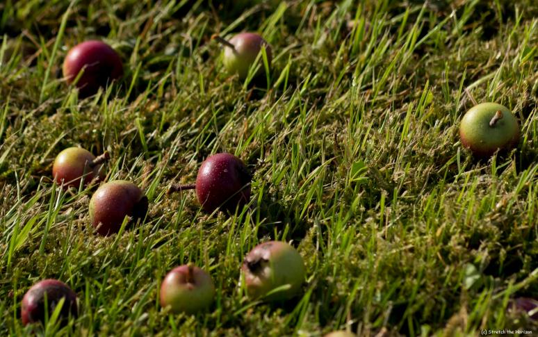A carpet of fallen Crab apples lie scattered across the grass, discarded to Nature’s whim and Evolution’s intention…