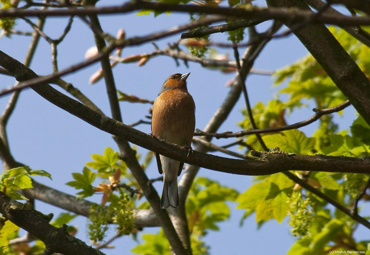 A male Chaffinch perches on a branch, his pastel pink breast on show for all to see.