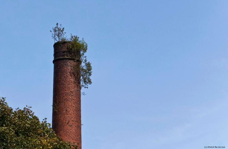 Poking up through some trees just past Jubilee Bends in Shaw, Oldham is a long-forgotten and abandoned chimney that belongs to Bee Mill. Amazingly, its crumbling red bricks are now home to saplings that have managed to garner a root hold many years before in the mortar-less grooves and probably continue to thrive due to the amount of rainfall the borough receives annually.