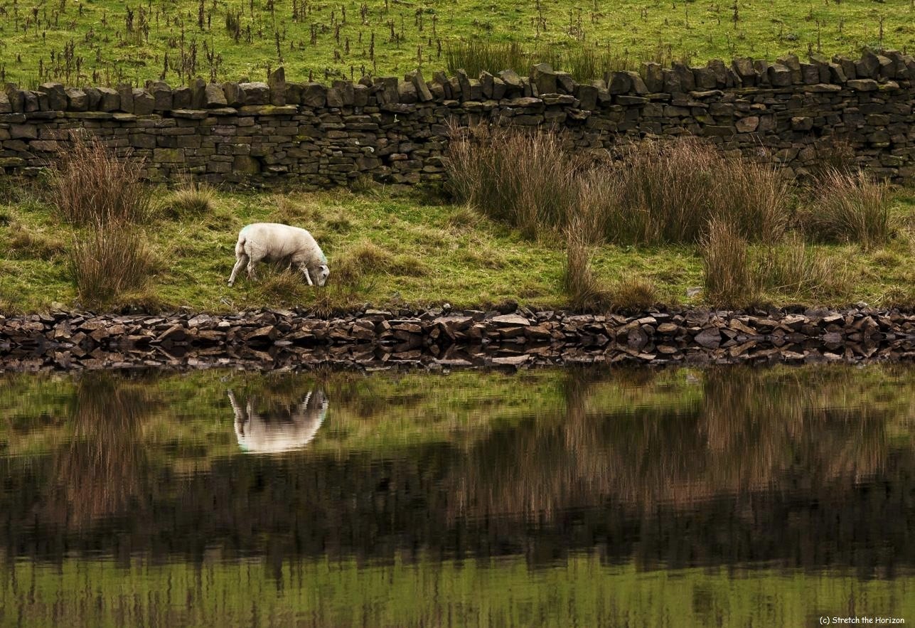 A Sheep munches her way around the banks of Hanging Lees reservoir in Piethorne Valley, Newhey and casts an almost distortion-free mirror image of herself onto the water’s calm surface.