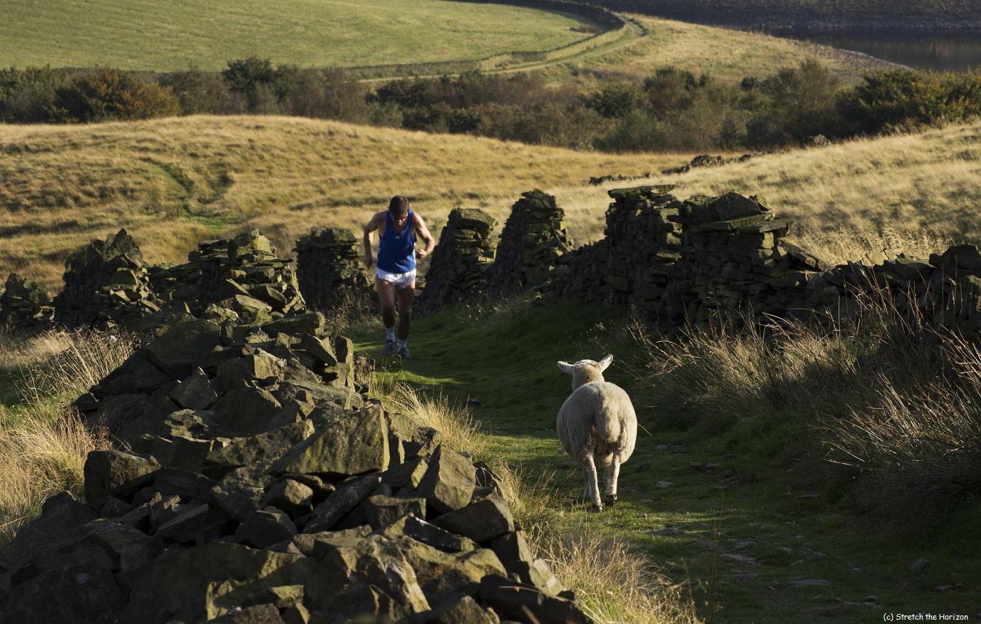 A fell runner – head down as he battles against the latest moorland incline – is oblivious to the Sheep that’s slowly approaching him. If the runner’s lucky, the Sheep will scurry off as Sheep tend to do when faced with anything out of their ordinary grass-chewing day; on the other hand, if this Sheep turns out to be a male Ram, I feel sorry for the bloke in the unprotected shortest of shorts!