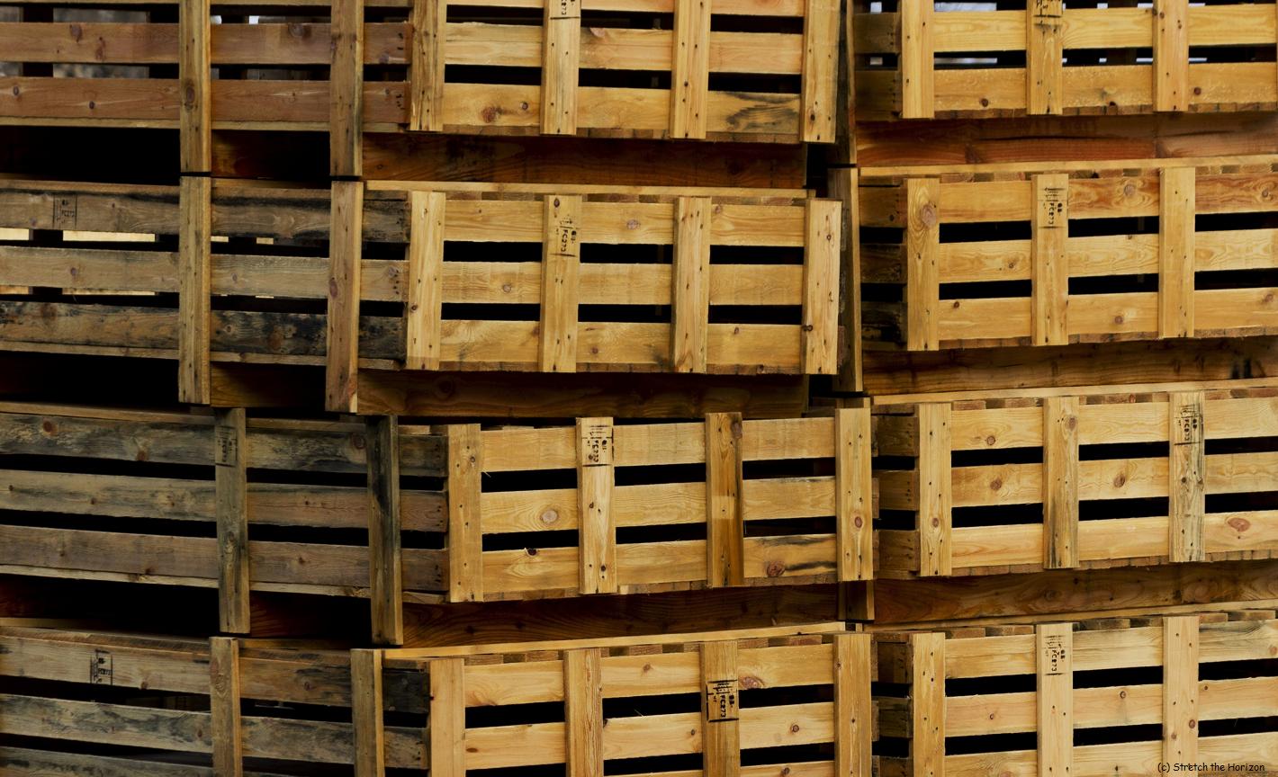 Box-shaped wooden pallets – complete with their company stamps – stacked and ready to go once the day’s work is finished.