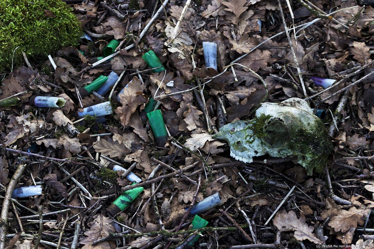 On a bed of fallen Oak leaves, hidden away in the corner of a forgotten field somewhere, lie numerous spent shotgun cartridges of different colours along with the skull of an unknown four-legged mammal. Judging by the rusted brass bases of the shells and the rooted mosses covering the weathered bone, whatever the reason may have been for this killing, it has been lost to another generation a long, long time ago, leaving us with nothing more than a scattered memory to be found lying on a bed of fallen Oak leaves, hidden away in the corner of a forgotten field somewhere…