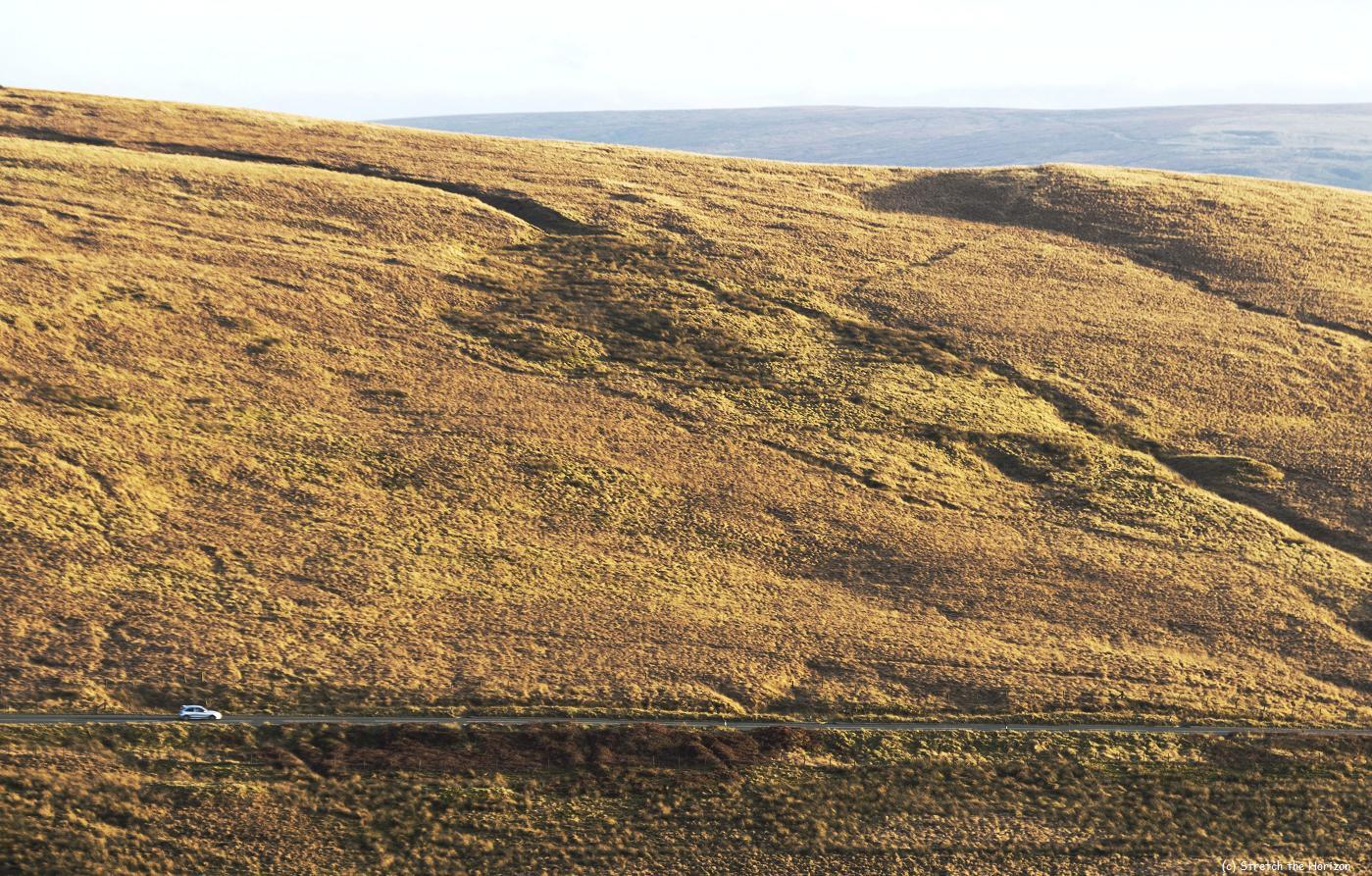 The moorland hills of Denshaw are parted by the A640 – otherwise known as Huddersfield road – as its tarmac snakes and curves around the Dowry reservoir and the adjacent water, New Years Bridge reservoir. Entering the frame from the left-hand side along this sliver of white-dashed pitch is a silver Rover MG ZR, reduced to nothing more than a mere echoing speck within this Land of Sleeping Giants.