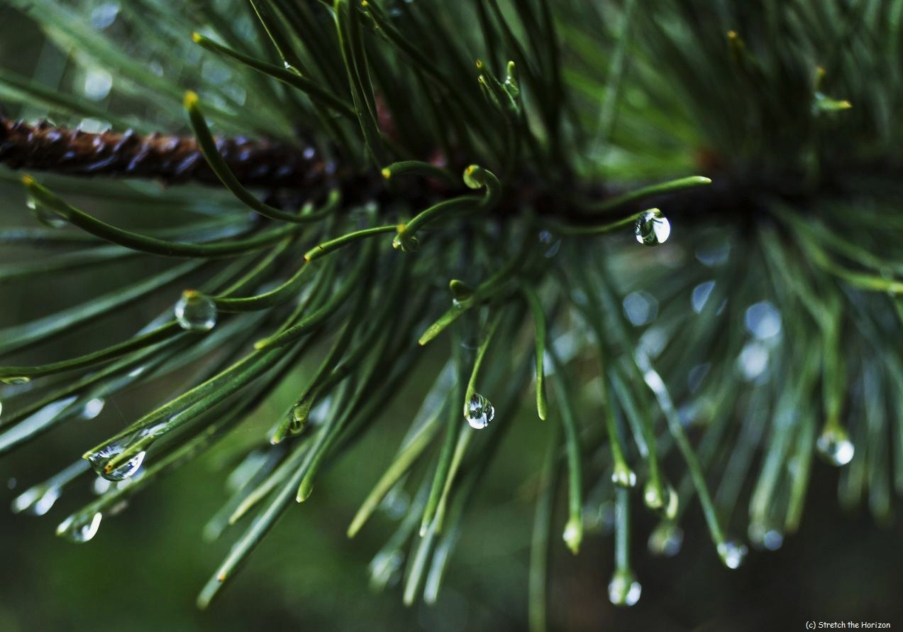 A quick sprinkling of rain and this Pine tree’s needles become endowed with shimmering baubles of watered light, awaiting gravity’s pull to shed their weight.