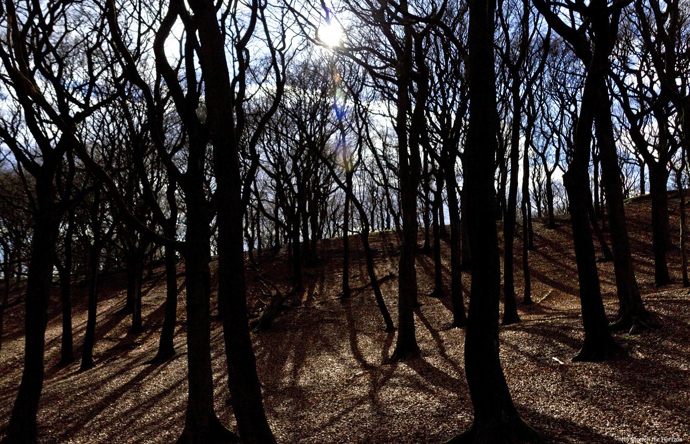 A multitude of Beech tree trunks casting shadows across their accumulated leaf litter.