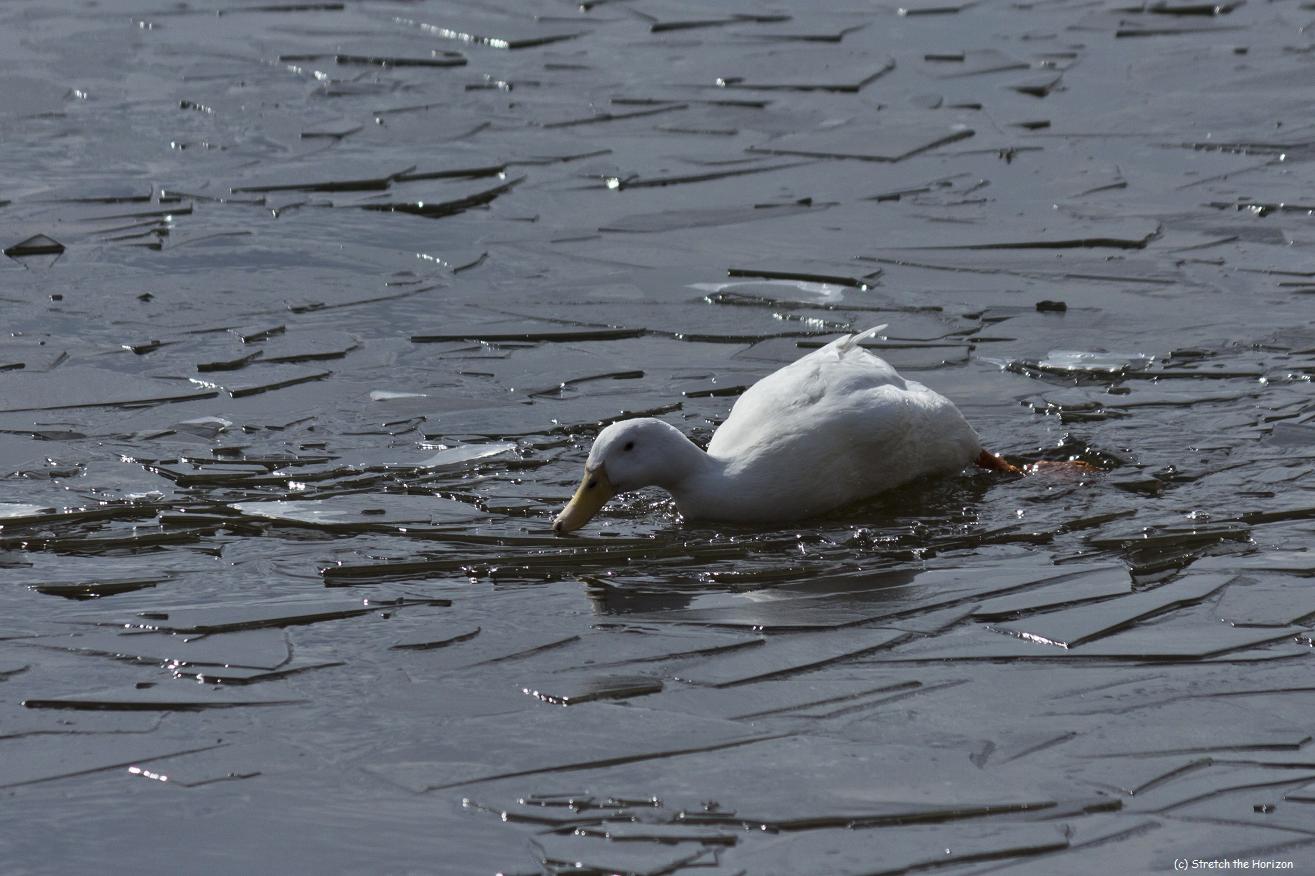 This Duck has become some kind of ‘avian ice breaker’, paddling through the shattered plates of ice as it races to reach some thrown bread, just out of shot.