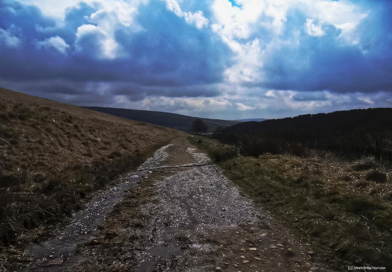 A downpour’s excess water glistens and glints as it snakes away into the surrounding moorland, intent on escaping the overhead glare.