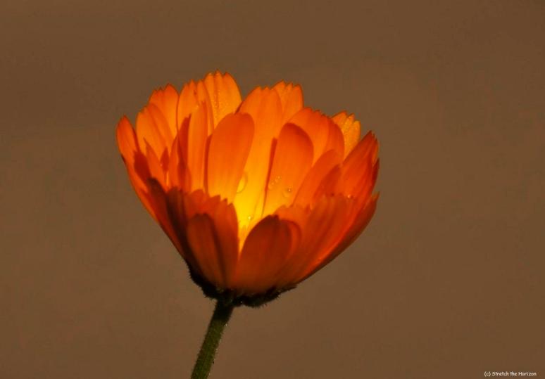 This Marigold’s flame-orange petals are open just enough to have collected some water droplets from an earlier rain shower, thus giving the flower a spattering of moisture to cope with another humid Summer’s day.