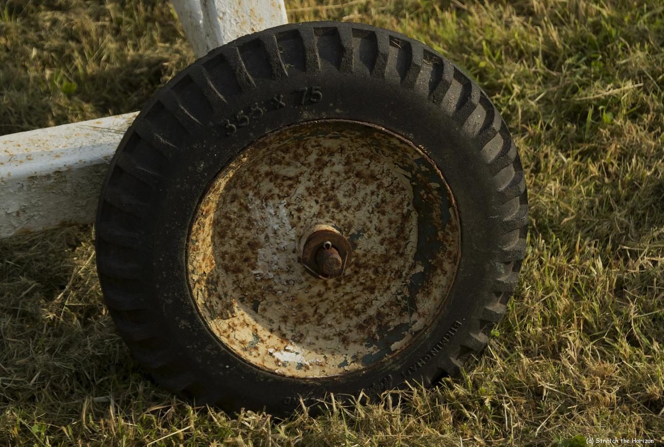 The flaking white paint – complete with the subsequent background rust – within this wheel’s centre hub shows how being used on a movable Cricket backdrop has taken its toll over time…