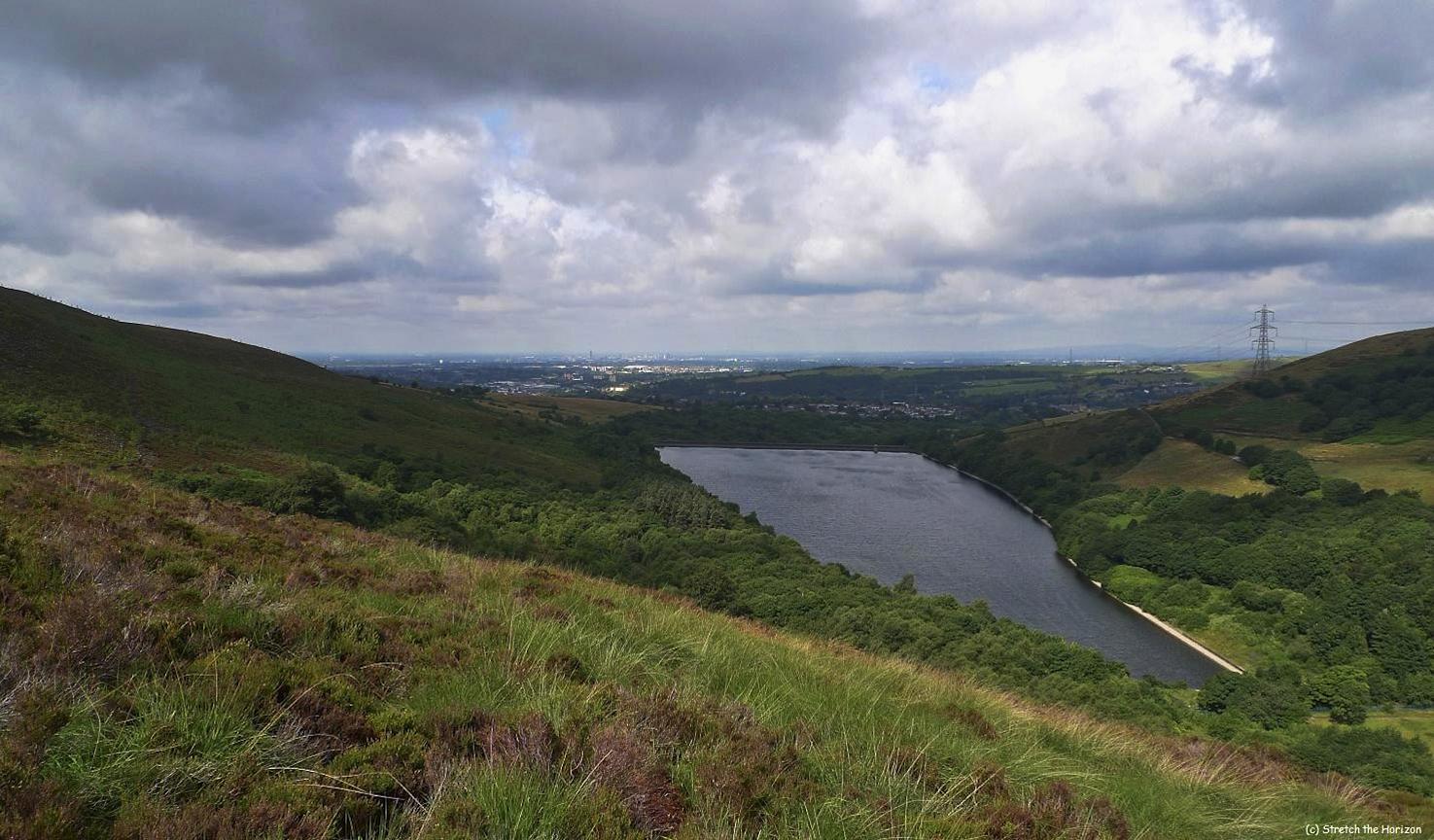 A panoramic view shot high on the moors above Walkerwood reservoir in Millbrook, Stalybridge looking out across Cock Wood and off towards the distant skyline of Manchester city centre.
