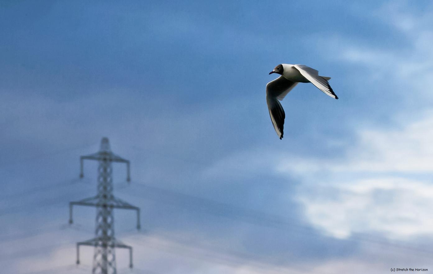 A Black-headed Gull effortlessly glides past a distant pylon; a vast metallic behemoth that’s really messed with this photo’s background blur or bokeh. (I don’t think anyone has noticed it though, right….?!)