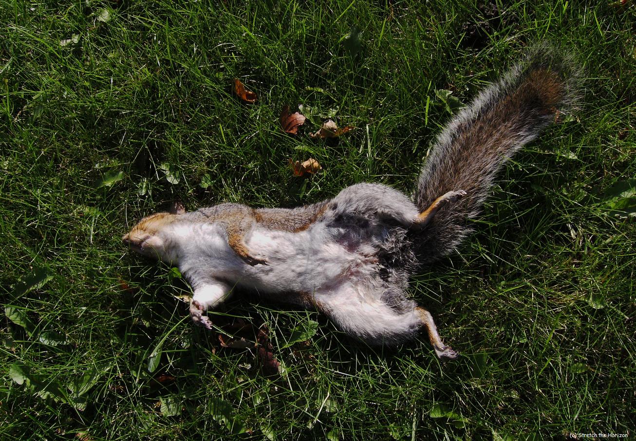 If the question is “Why did the grey Squirrel cross the road?” then this picture may go some way to explaining why the bushy-tailed rodent didn’t actually reach the other side…