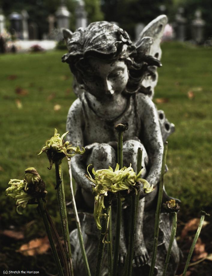 A graveside’s flowers’ petals fade beneath the mournful gaze of this winged Faerie statue.