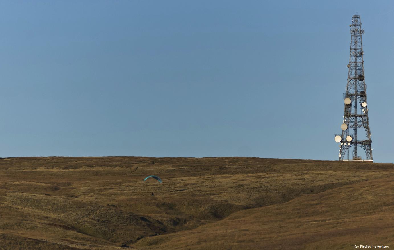 A Para Glider attempts to take off and soar from moorland just beneath Windy Hill mast, which stands at the top of Piethorne valley in Newhey and overlooks the M62 beyond Milnrow. Unfortunately for this intrepid ‘birdman’, running along a rut-filled and boggy moor is only going to hinder more than help any potential aerial take-off…