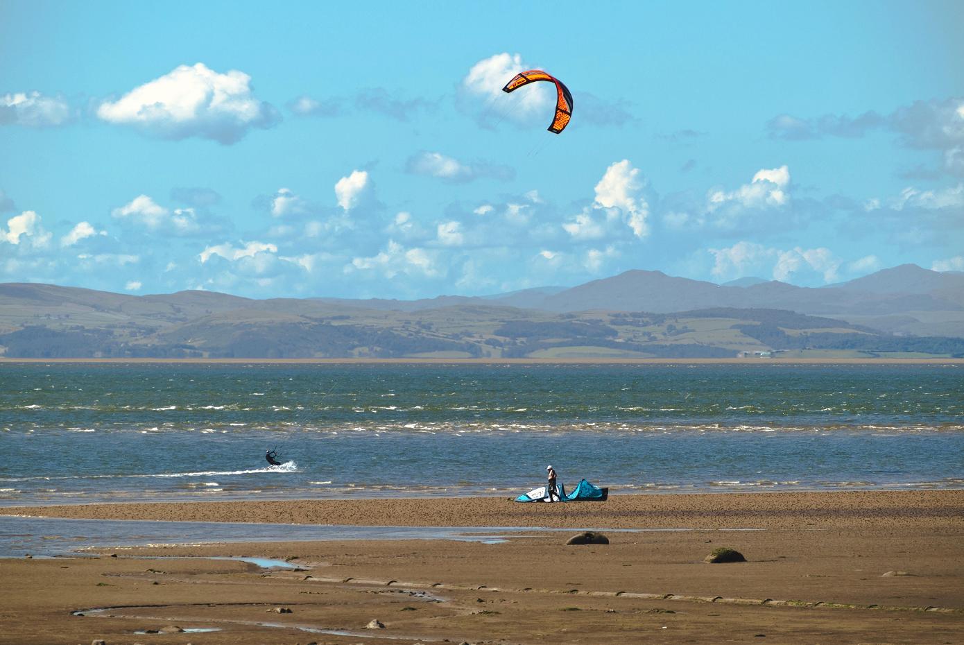 Two Kitesurfers in Morecambe Bay show off their individual styles: one is busy carving through the sea’s surf under the power of the wind (and looking spectacular whilst doing so); the other is just too busy looking for a pump to inflate his crumpled kite (and possibly their deflated ego as well)…