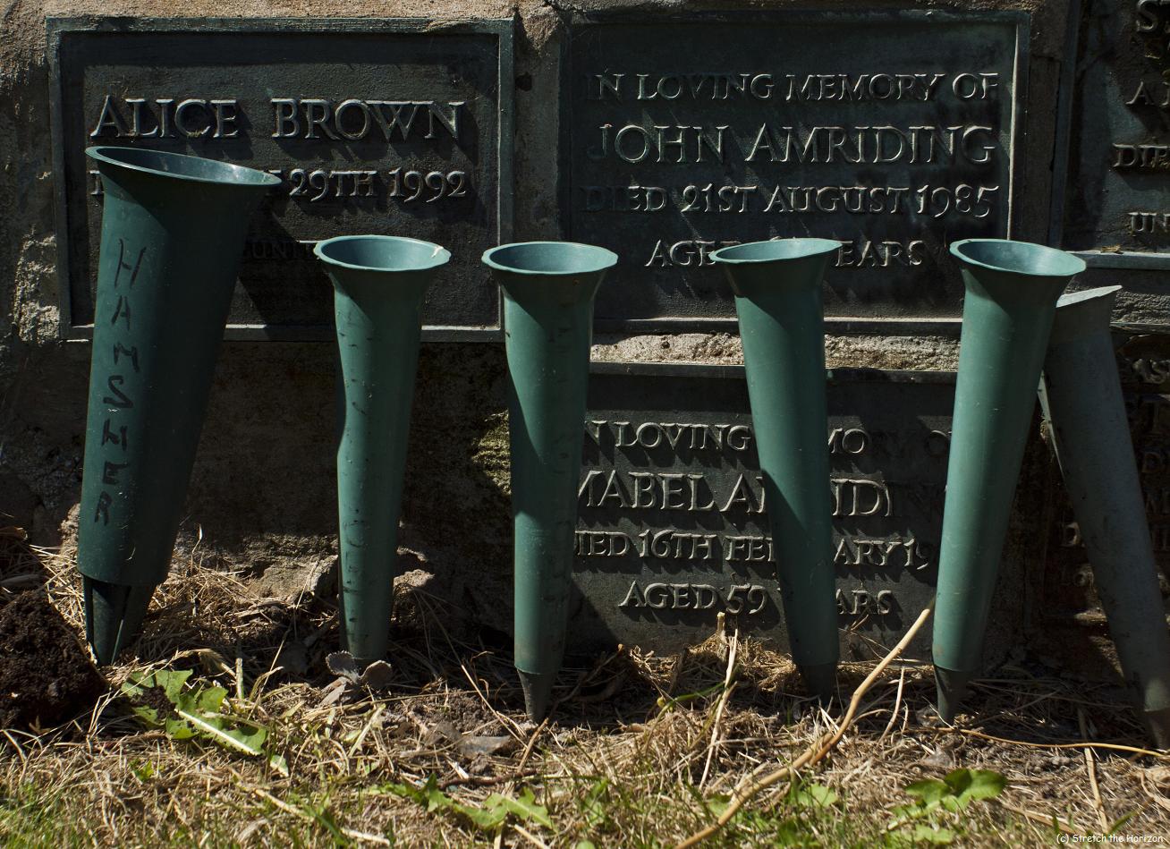 Empty vases tilting and hollow, awaiting the next deposit of remembrance flowers to arrive…