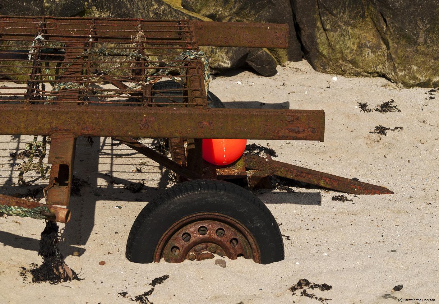 A boat trailer sunk to its axle in the sand and left to rust with each incoming tide.