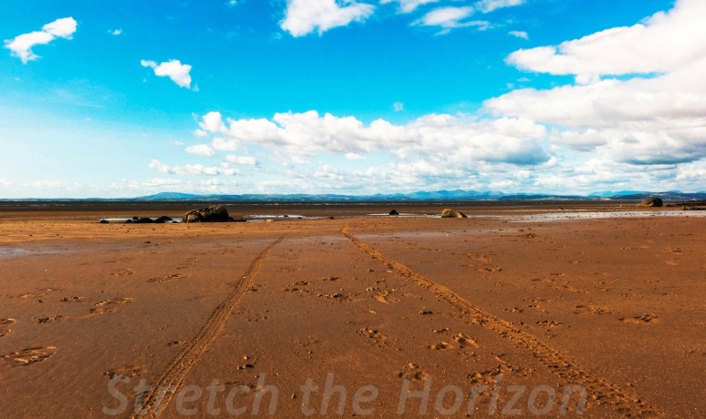 The sand at Heysham beach in Morecambe Bay retains the surface memories of visitors from a busy day: someone’s boot footprints run parallel with a Dog’s scattered trot, which criss-cross the tyre tracks of a boat trailer that disappears into seawater pools just beyond some outlying rocks, all played out against the stunning backdrop of the Lake District’s distant Rydal Mountains off in the distance…