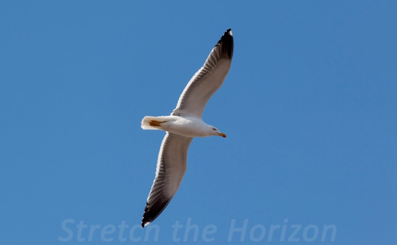 A Herring Gull soars effortlessly across the expanse of blue sky overhead, its five feet plus wingspan revealing the seabird’s imposing size.
