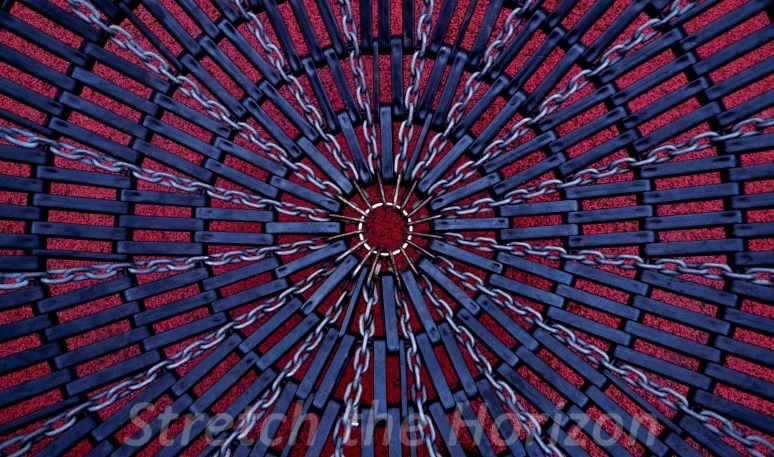 A close-up shot of a children’s playground swing takes on a new dimension, as your eyes try to focus on the chrome and black construction of the seat against the red background of the anti-slip flooring…