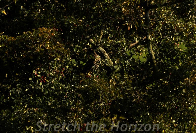 A Little Owl perches within a Hawthorn tree, camouflaged almost perfectly except for its single yellow eye glaring from within the depths of the foliage.