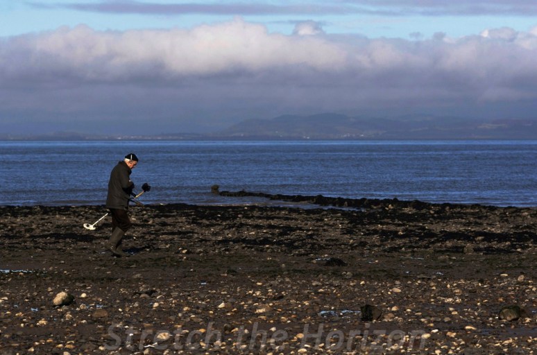 A metal detectorist on Heysham beach gets ready to begin a new sweep of the shingle, just in the hope of striking it lucky and discovering a medieval golden trinket instead of another flattened Coke can…