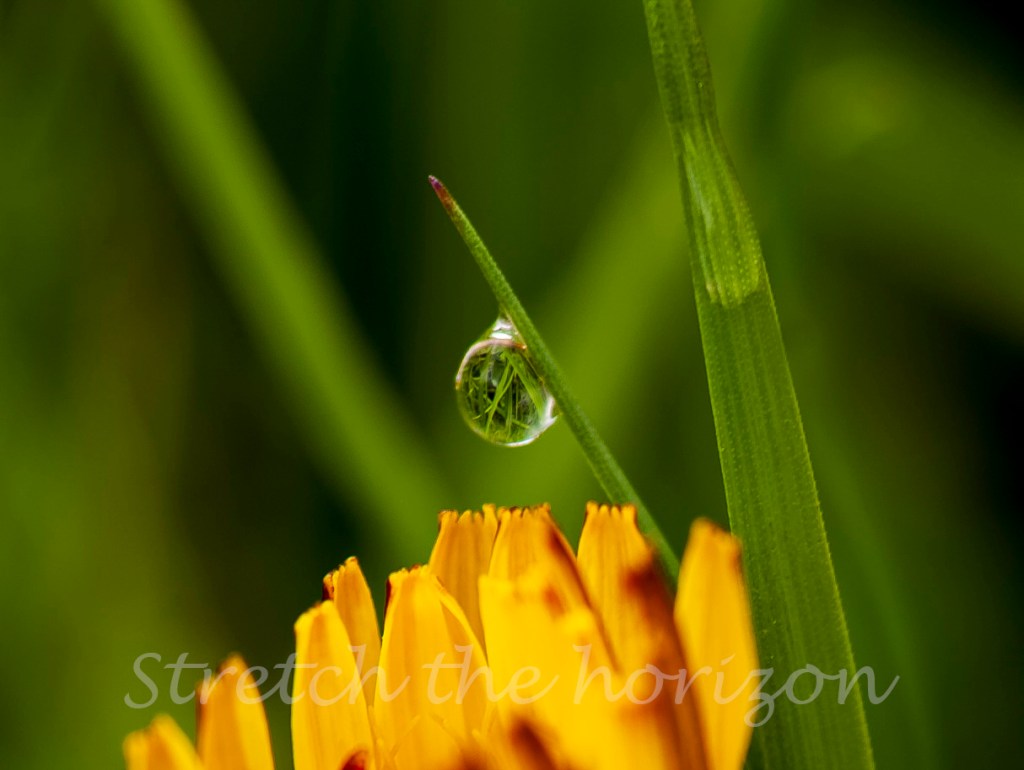 A tangle of grass stalks are reflected on the surface of a water droplet, the view of the world reversed upside down and now dancing across the tension of the liquid’s meniscus.